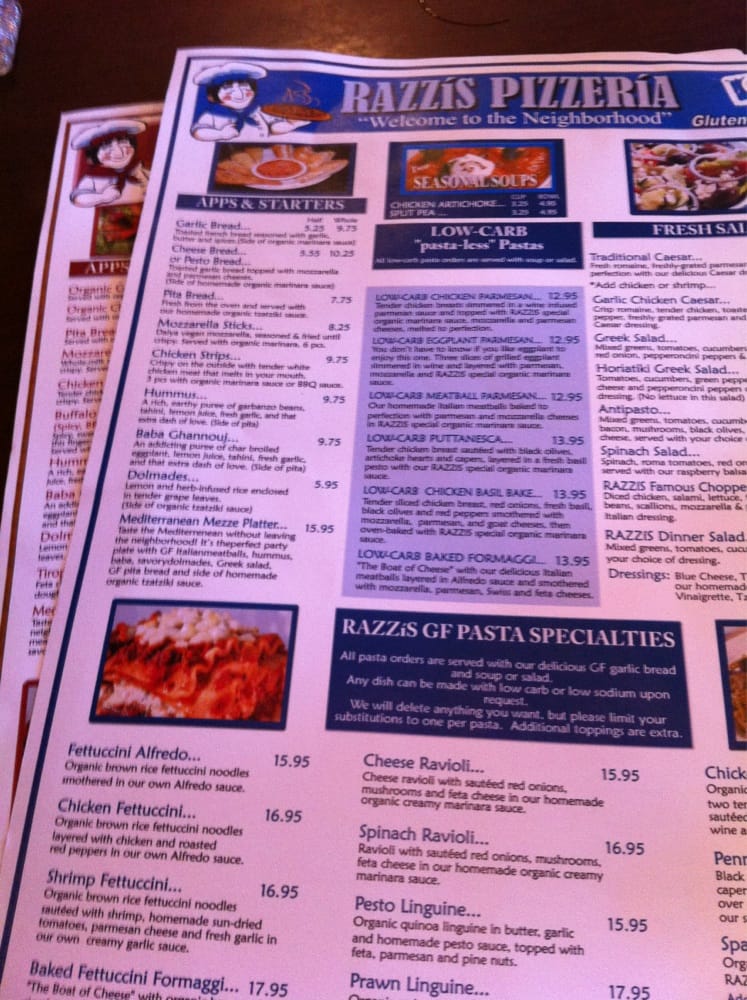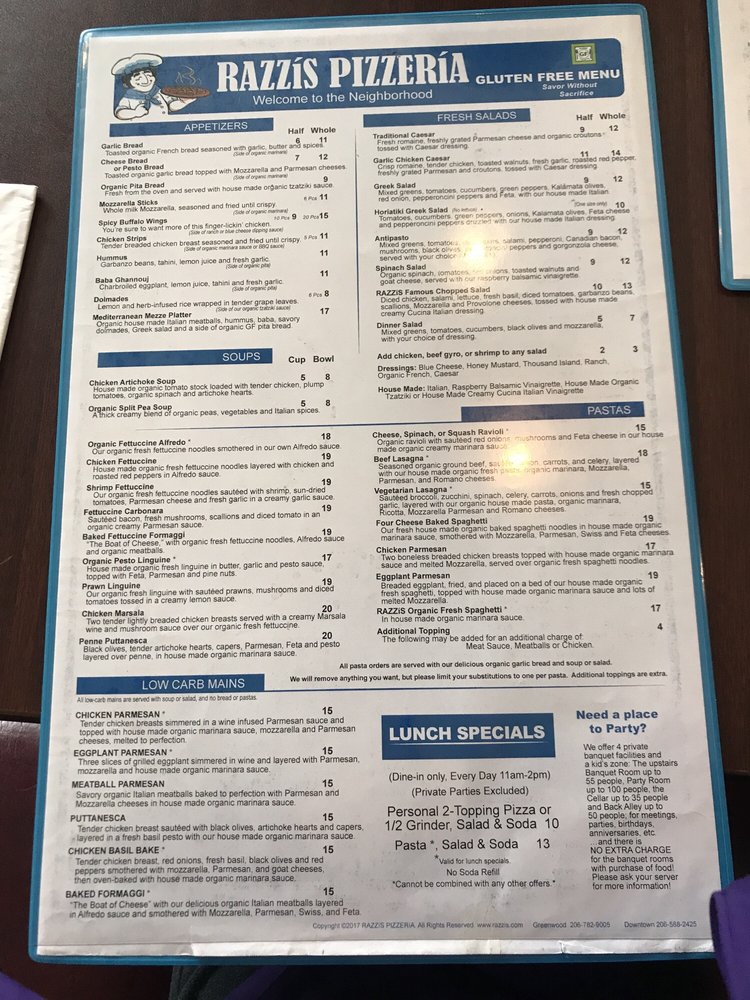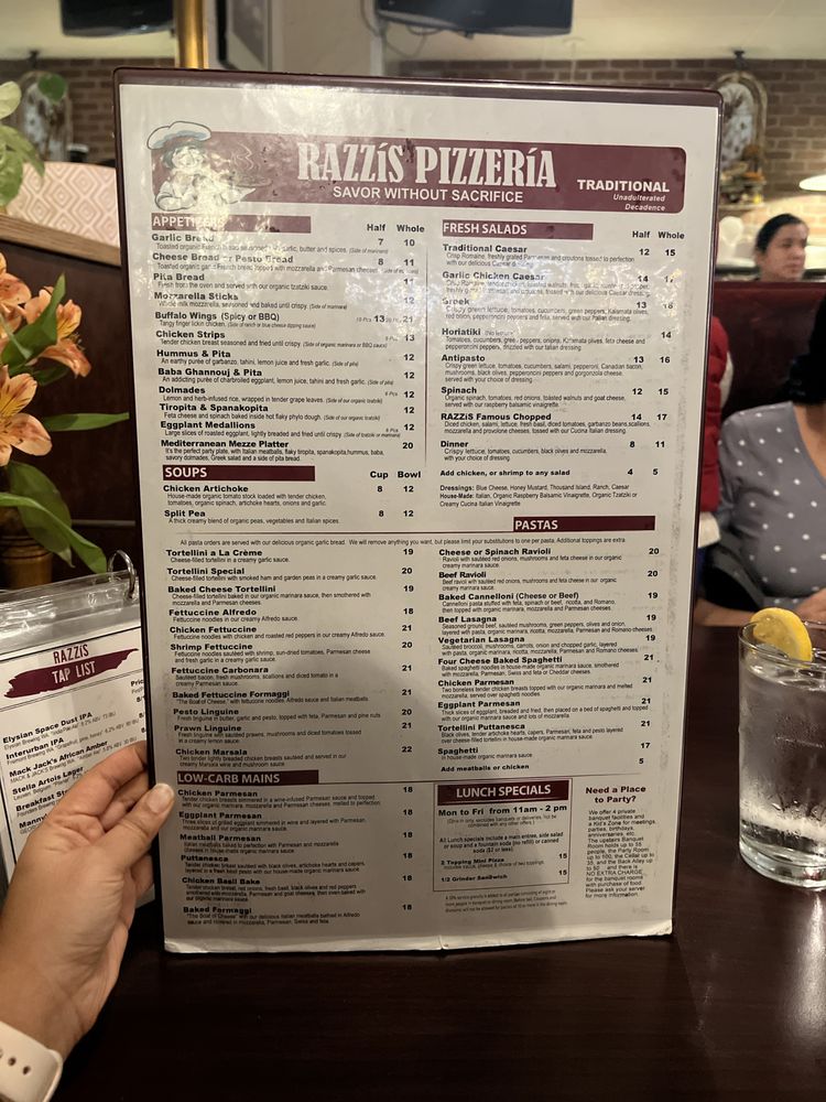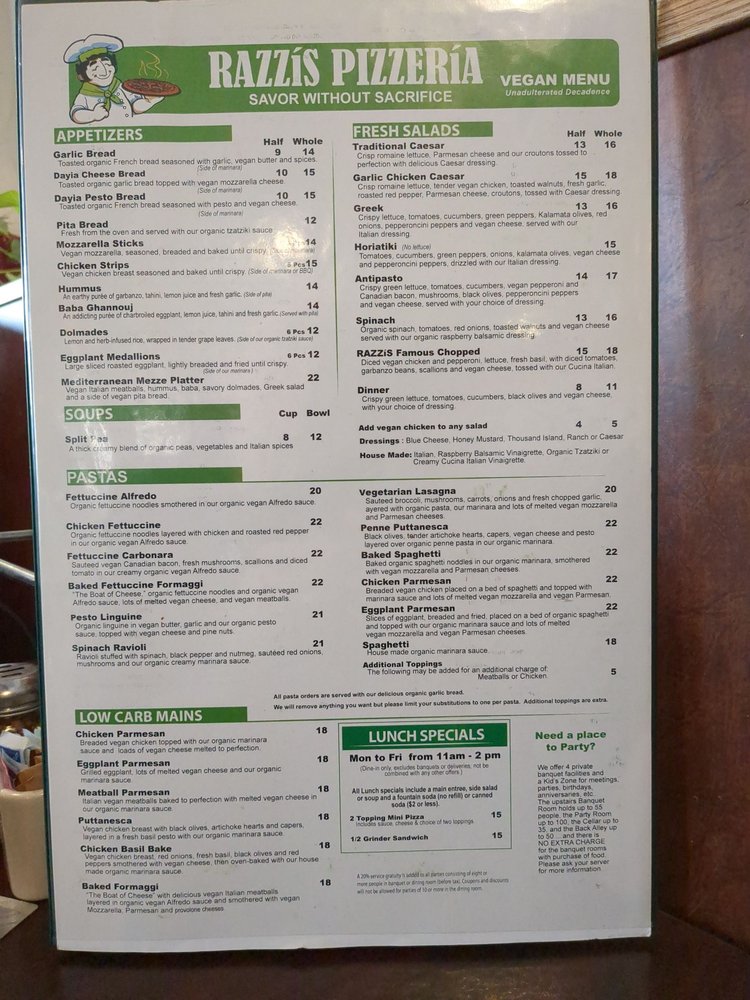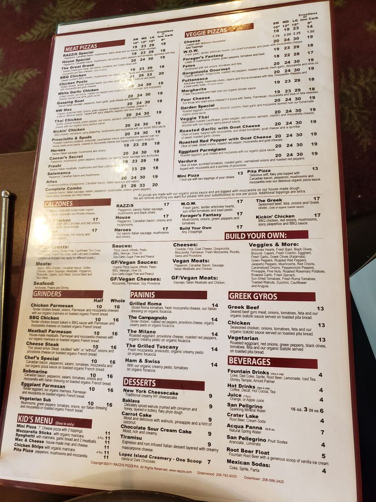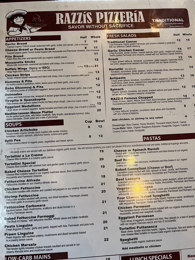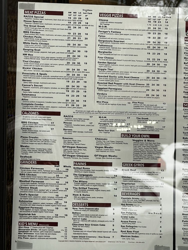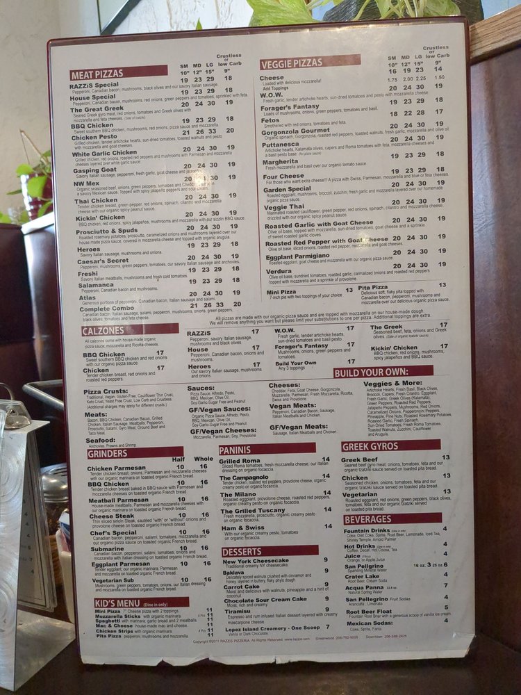 Razzís Pizzería in Seattle offers a variety of traditional appetizers, soups, and salads with vegan and vegetarian options. The menu features items like Garlic Bread, Cheese Bread, and Pesto Bread, along with Chicken Artichoke Soup and Organic Split Pea Soup. Customers praise the fresh and hand-made food, friendly service, and gluten-free and vegan options. One patron raves about the savory dishes, exceptional service, and casual ambiance, calling it a "must try." Another highlights the extensive vegan menu, recommending the Eggplant Parmesan and Pea Soup. While some reviewers mention high prices and parking challenges, the overall consensus is overwhelmingly positive, with compliments on the delicious pizza and flavorful dressings. Razzís Pizzería is a great spot for a date night or gathering with friends, offering a warm and inviting atmosphere.