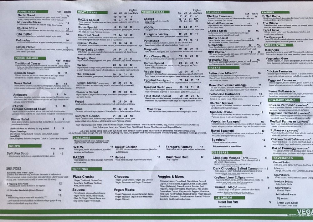 Vegetable with sauteed mushrooms, green peppers, olives & onion, layered with pasta, organic marinara, vegan ricotta, mozzarella, Parmesan & Romano cheeses.